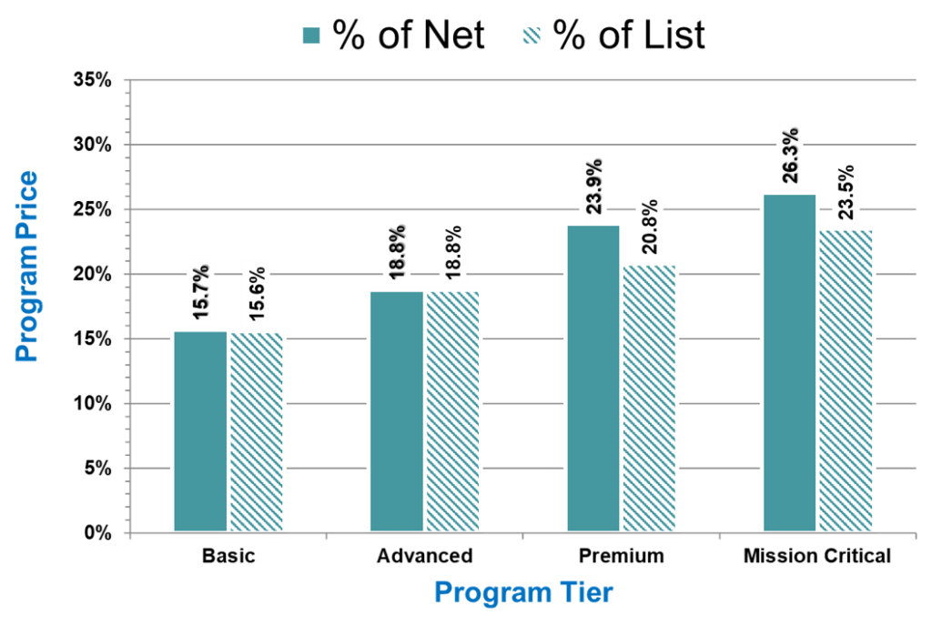 The average prices for Support programs range from 15.6 percent for a basic level of support to more than 26 percent for a high-end premium program. Prices vary based on the entitlements offered and the ways that pricing is structured. Here are a few considerations: