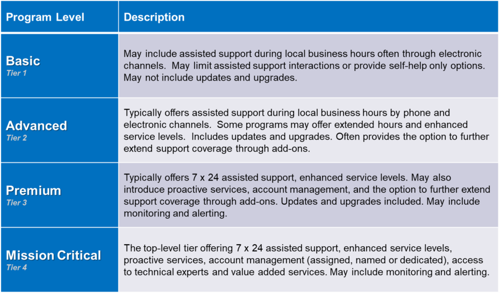 Support pricing is typically established by program level or tier. It is not uncommon for support portfolios to consist of two or more tiers with names like Silver, Gold and Platinum. Although support programs may sound alike, they often vary from vendor to vendor. For the purposes of establishing baseline pricing benchmarks ServiceXRG has normalized support programs into the four distinct tiers described below. Classification is based on the underlying program entitlements and not on the program names.