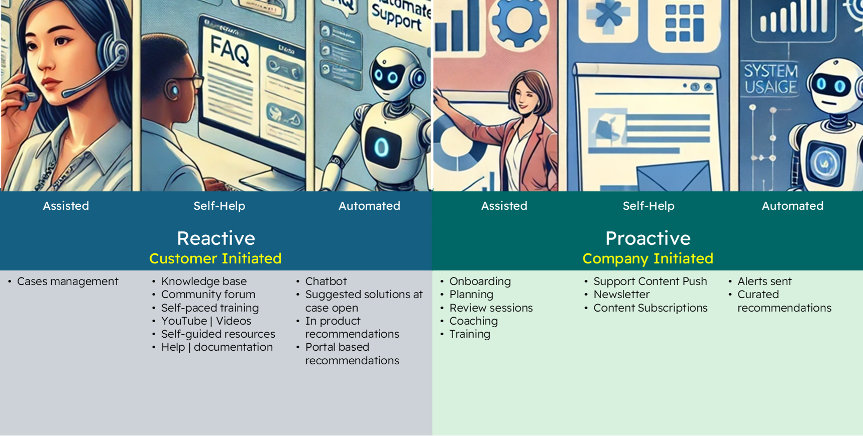 Each delivery channel may be used to reactively or proactively engage with customers. Reactive engagement is initiated by customers. Proactive engagement is initiated by the company.