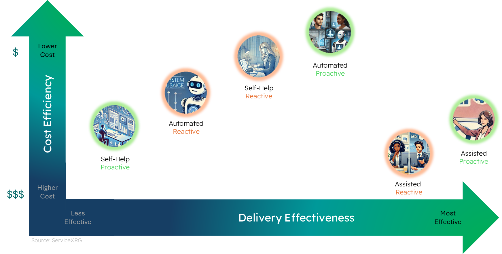 Optimizing Support Efficiency requires a balance between delivery costs and delivery effectiveness. The costliest support methods – assisted engagement are the most effective. The lowest cost delivery methods – automation and self-help – cost less per engagement but are not the most effective at resolving customer issues.