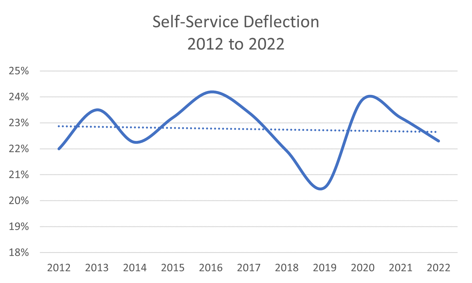 For the past decade, reported self-service deflection has averaged 22.8%. The industry trend for deflection has sloped down slightly.