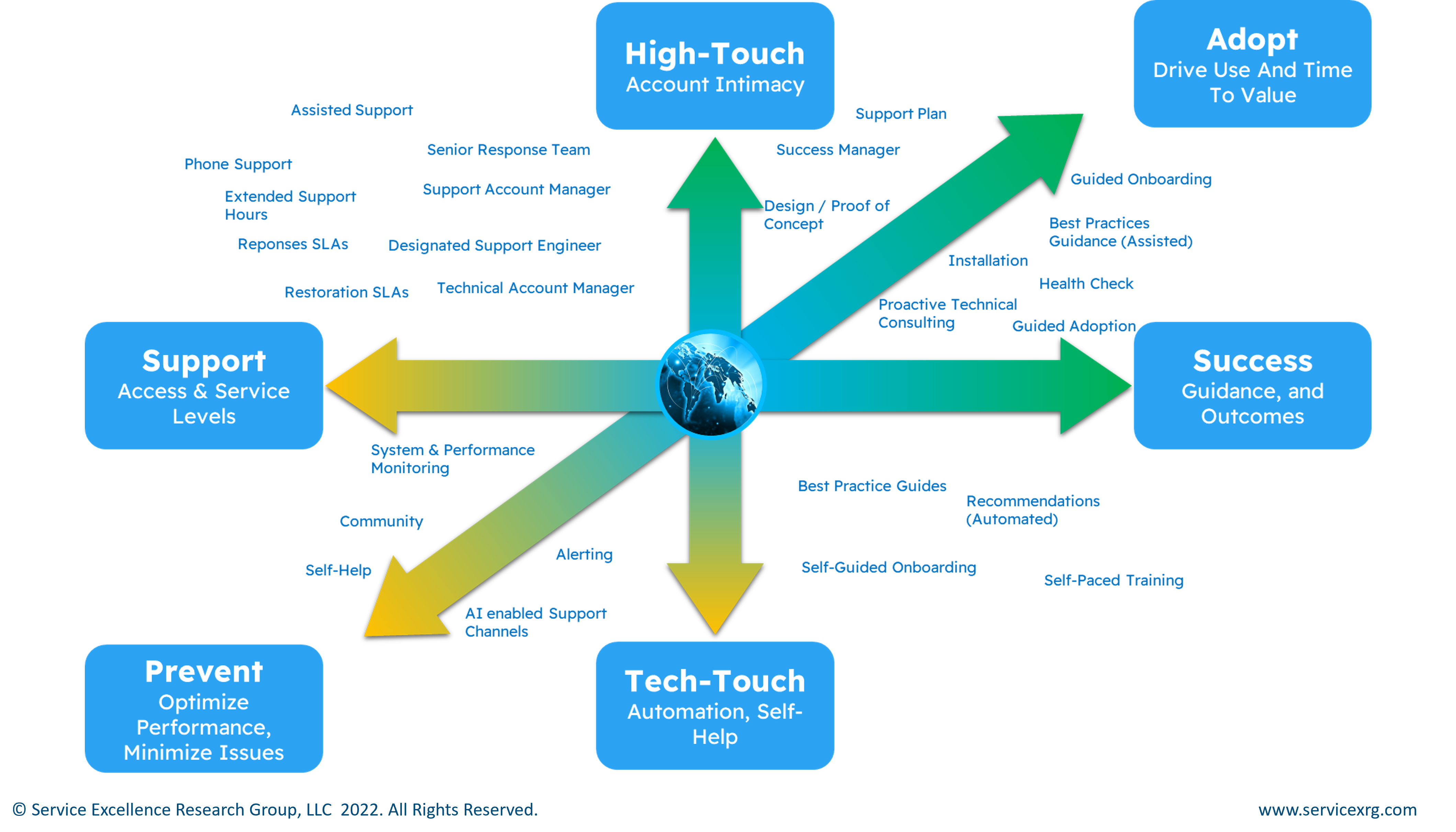 Customer needs may be served through a variety of services including self-help, tech-touch engagement, and high-touch interaction.